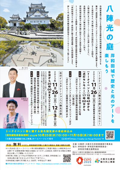 会期初日には、「八陣光の庭」点灯セレモニーに加え、岸和田城の歴史や八陣の庭に秘められた意味を紐解くトークイベントのほか、岸和田市観光振興協会が主催する「岸和田城ぶらり旅~岸和田に眠る城郭遺構~」も同時開催します。