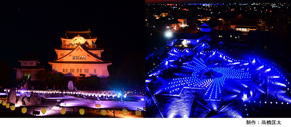 ※期間中の金曜日、土曜日及び日曜日は、岸和田城天守閣の開場時間を20:00まで延長し、光のアートで彩られた八陣の庭を天守閣からご覧いただくことかできます。(天守閣最終入場は19:30まで)