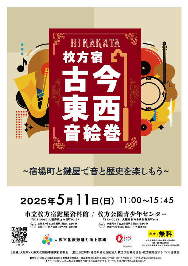 江戸時代、京と大坂を結ぶ京街道と淀川を往来する上で重要な場所であった宿場町「枚方宿」で、様々な音が交わる特別なイベント「枚方宿 古今東西音絵巻~宿場町と鍵屋で音と歴史を楽しもう~」を開催します。