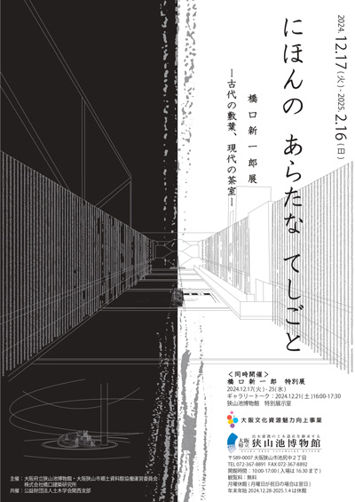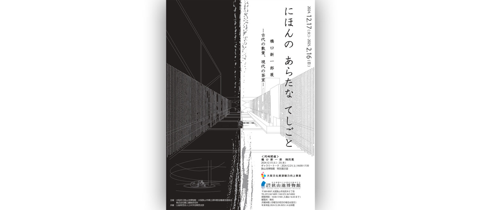 大阪府生まれの建築家、橋口新一郎のアートインスタレーション作品の展示。当館の屋外エリア(水庭と円形コート)に作家の代表作「織物の茶室|霞庵」と狭山池の堤に使われている古代の技術「敷葉工法」から着想を得た新作の2点を展示予定。作家は、日本の伝統的な技術や感性に着目し、次々と茶室を発表し国内外で高い評価を得ている。