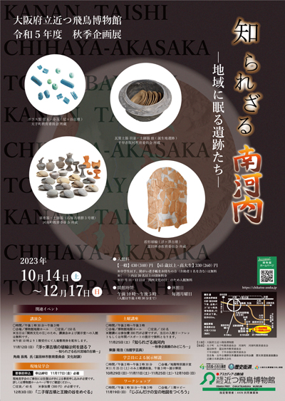 令和5年度秋季企画展では、博物館の所在する南河内郡(河南町・太子町・千早赤阪村)および富田林市の石川流域に焦点を当て、それらの地域に眠る、知られざる遺跡とそこから出土した考古資料を紹介します。この展示がきっかけとなり、当地域の歴史や文化について興味を持っていただければと思います。