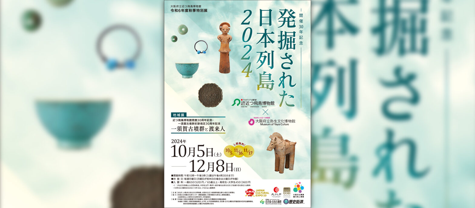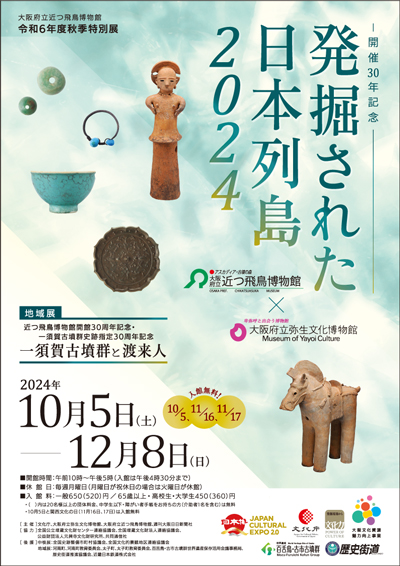 大阪府では10年ぶりの開催となる「発掘された日本列島展」は、近つ飛鳥博物館と弥生文化博物館の合同で開催いたします。近年の発掘調査で出土した文化財や、調査で明らかになった最新の研究成果をご覧いただけます。また、地域展として当館の周辺に広がる一須賀古墳群と府内の関連遺跡をとりあげた「一須賀古墳群と渡来人」を同時開催いたします。