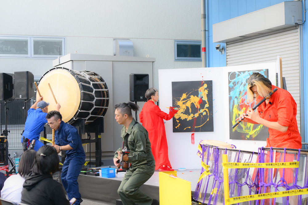 和太鼓に加え尺八や三味線が演奏されます。また、スペシャル企画として上山製作所本社工場のサウンドサンプリングを織り込んだ演奏など、サイバーなリズムと和楽器とのコラボレーションも印象的でした。