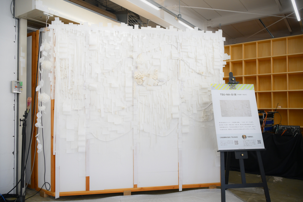 三和紙業株式会社も作品制作の場のひとつで、アーティスト・慈観雅之氏の「つなぎ」をテーマにした紙のインスタレーション作品『TSU-NA-GI 開(つなぎ・ひらく)』が展示されました。