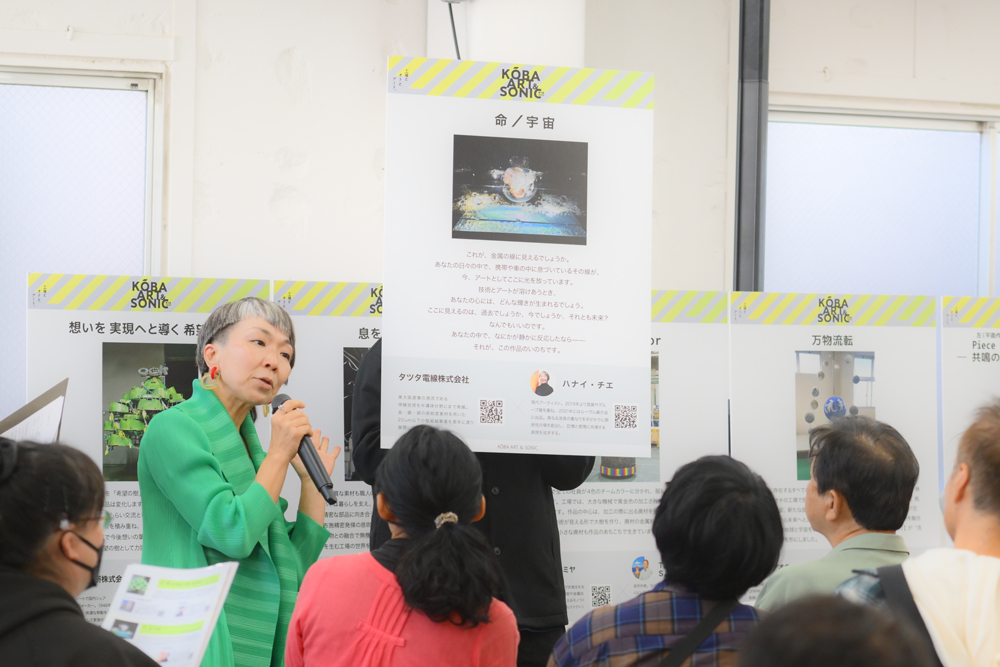 「ものづくりを盛り上げて、東大阪のものづくりが日本の、世界のものづくりを支えているんだと誇りを持ちながらやっていきましょう」と激励。そして、「東大阪市長賞」に選ばれたのは、ハナイ・チエ氏とタツタ電線株式会社とのコラボ作品「命/宇宙」です。