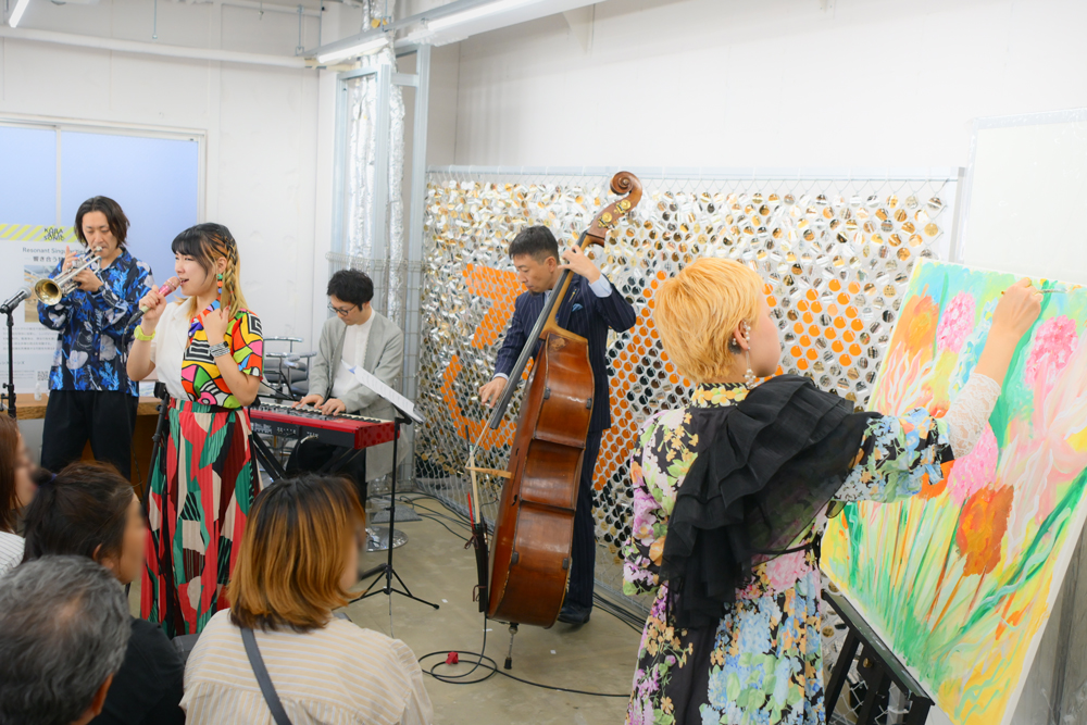 最後のプログラムはアートとジャズのコラボステージ。株式会社たくみ工芸とコラボレーション作品をつくったSky氏(作品名「Beyond Vector -その線の先ヘ-/Piece Beat-共鳴の鼓動-」)が、ジャズユニット「asobiyoshi」の演奏に合わせてライブペインティングを行います。お客さんたちは、ジャジーなリズムに体を委ね、みるみる仕上がっていく作品を見つめます。すると次第に、キャンパスいっぱいの花の絵が浮かび上がりました。