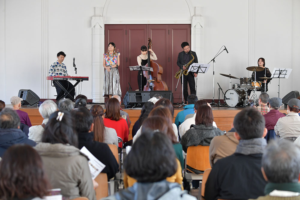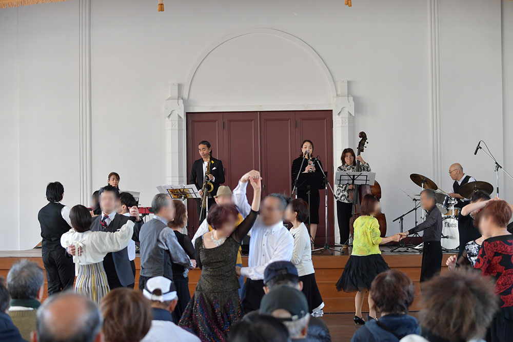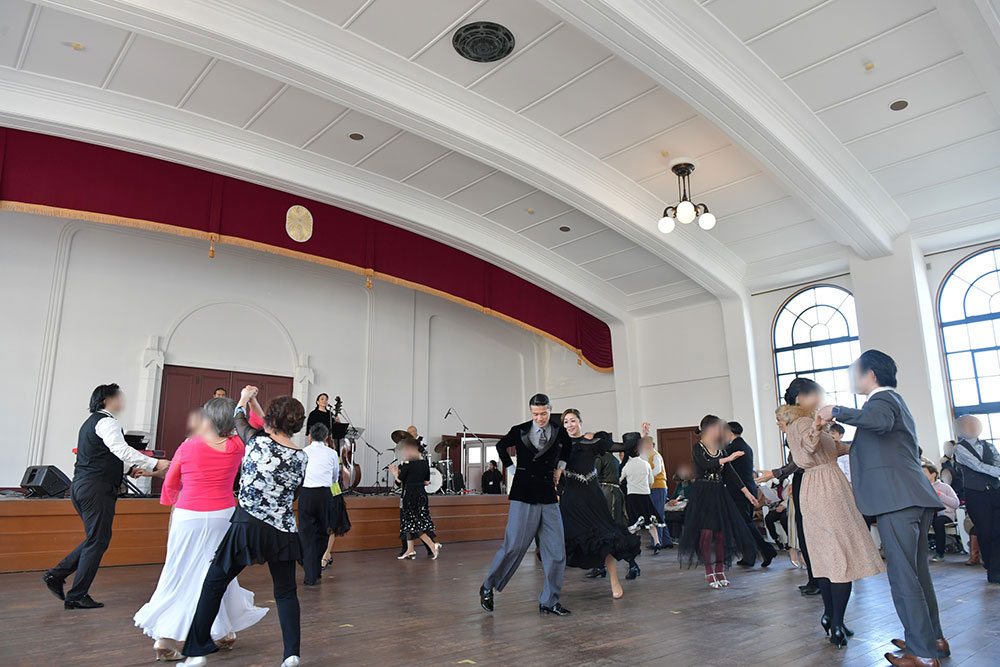 さらにイベントでは、スペシャルなライブも実施。第一部は大阪商業大学との共催で行われた「“昭和”のものづくりとジャズステージ」。歴史ある谷岡記念館を舞台に、当時のダンスホールの雰囲気を再現し、音楽とダンスで昭和モダンを甦らせました。