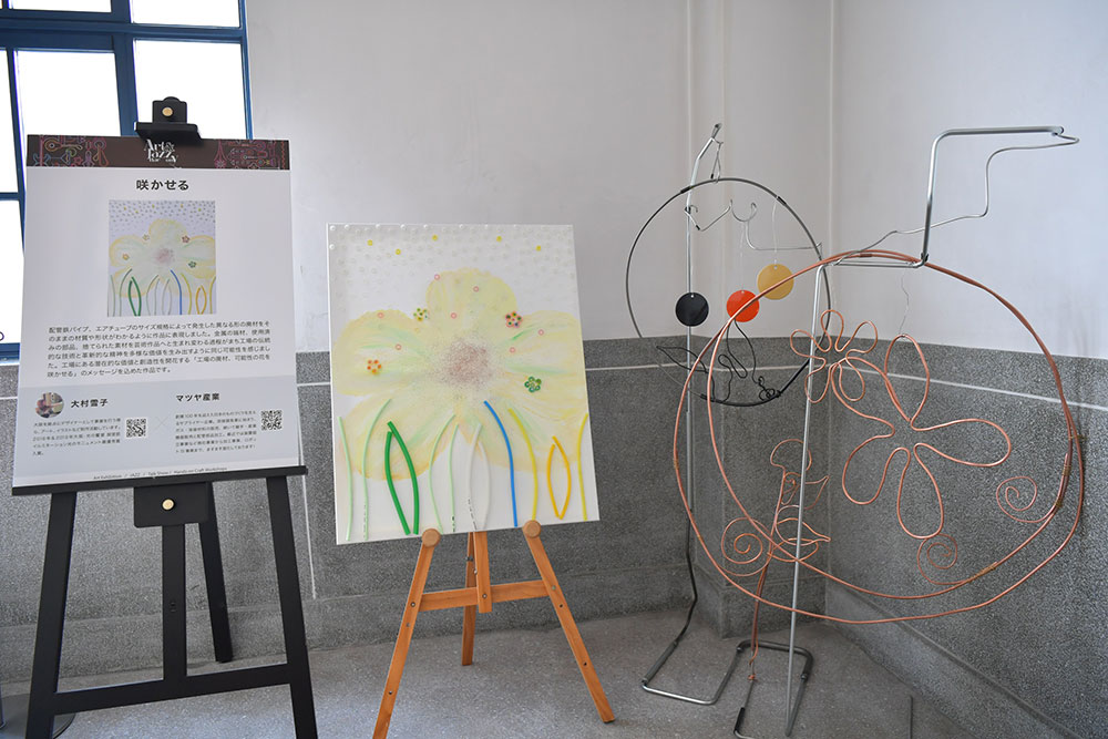 イベント当日には、コラボした企業の理念やビジョンなどをアーティスト自身の解釈で作品化した「ファクトリーアート」作品を会場内の各所に展示。鉄パイプやエアチューブ、車のホイール、ネジなどを使った独創的な作品が、多くの人の注目を集めていました。
