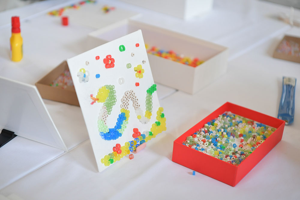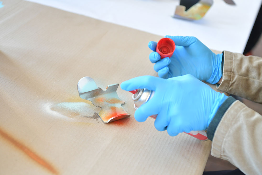 プログラムの合間には、ファクトリーアートの制作を行った企業とアーティストが、それぞれの視点を取り入れた「ものづくり×アート ワークショップ」を実施。「廃材でスマホスタンドを作ろう!」は、曲げ加工を施した廃材にスプレーで好きな色を付け、オリジナルのスマホスタンドを作るというもの。東大阪にちなんだ4つのオリジナルキャラをセル画で描いたのは「セル画で東大阪のオリジナルキャラを描こう!」。「ダイカストの廃材を使い、オリジナルアクセサリーを作ろう!」では、ダイカストの廃材でカフスやネクタイピン、ネックレスなどを制作しました。