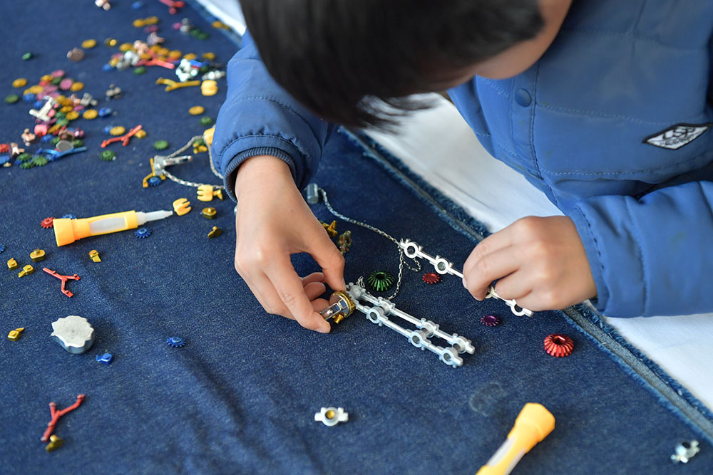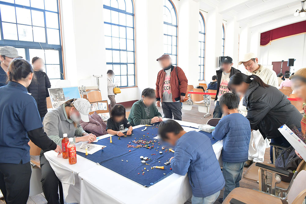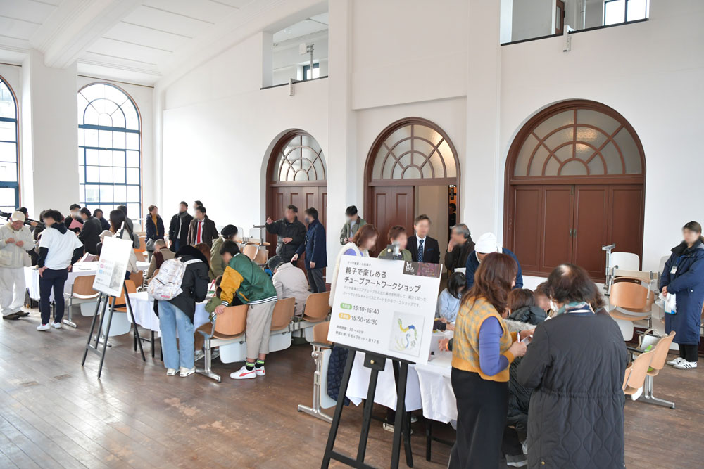 エアチューブから出た廃材を利用したアートを製作したのは「親子で楽しめるチューブアートワークショップ」。金属製の丸い廃材を使った「廃材で顔を作ろう」では、ペーパーウェイトとしても使えそうな作品を作りました。「針金で天使の人形作りワークショップ」は、参加者が廃材の針金を使って天使の人形を作ったほか、昔は藁で作ってホタルを入れて楽しんでいたという「ホタルカゴ」を針金で作ったものもプレゼント。どのワークショップにもたくさんの人が参加し、世界でひとつだけの作品を作ることを楽しんでいました。さらに「河内木綿のどんぐりストラップ作り体験」、「日本の伝統遊戯「将棋」に関する体験講座」なども開催されました。