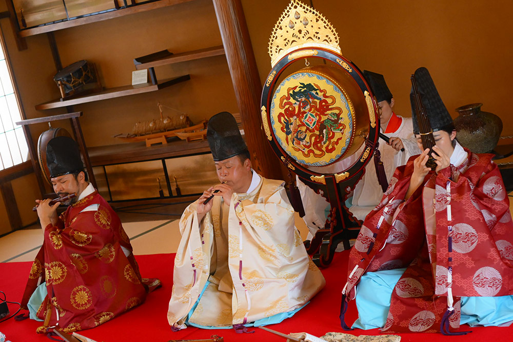前半は、「和風空間」(篳篥(ひちりき)・田中誠氏、笙(しょう)・芳村由記氏、竜笛(りゅうてき)・芳村直也氏)による、日本古来の音楽である「雅楽」の演奏です。1000年以上の歴史がある「雅楽」についてや、楽器の解説を交えながら楽曲を演奏。平安時代にタイプスリップしたような、時空を超えた特別なひとときを堪能しました。