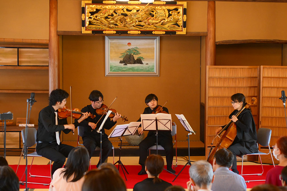 鍵屋主屋の建てられた江戸時代後期と同時期にドイツで活躍したベートーヴェンの曲の中から、明るく優雅な曲調の『弦楽四重奏曲第2番』を選曲。なかなか聴く機会のないクラシックの生演奏を、和の空間でたっぷり楽しみました。