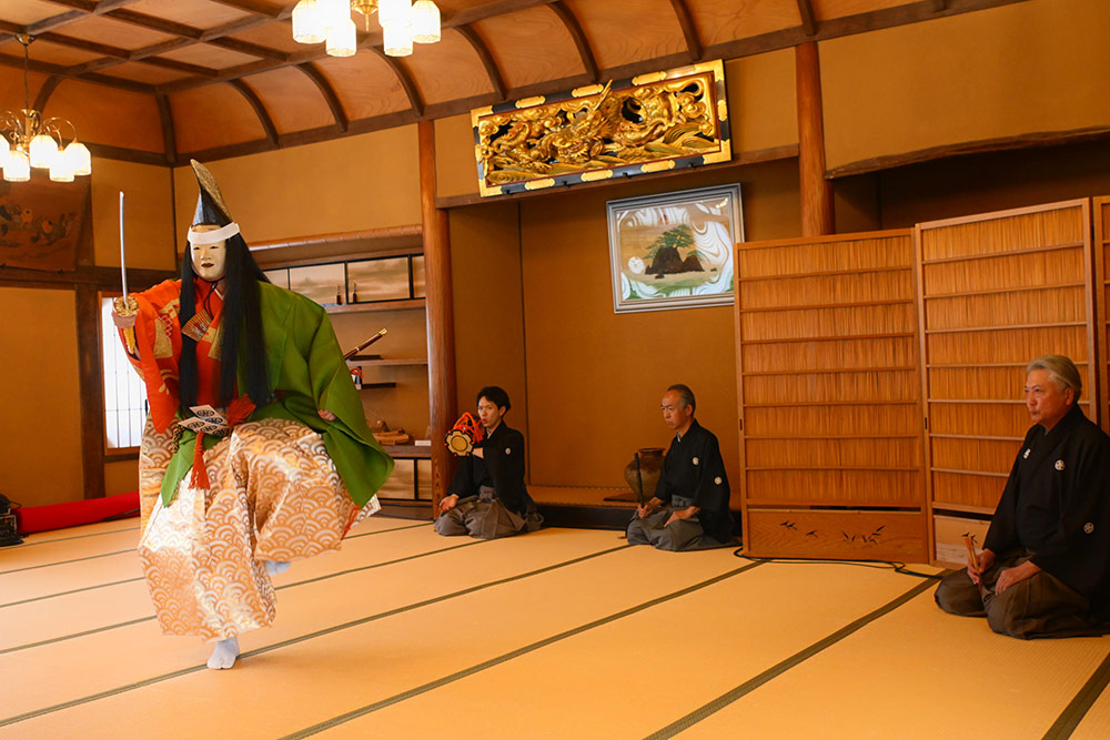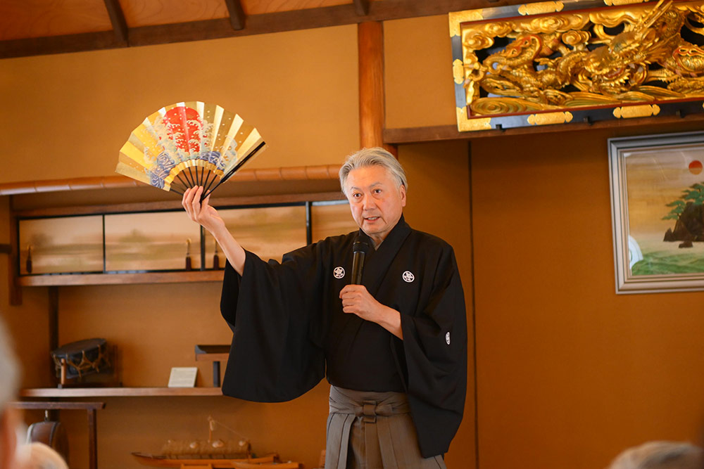 囃子として演奏される小鼓と笛について解説後、『敦盛』を披露。神秘的で幽玄な世界が大広間に広がり、時が止まるほどの迫力です。感動ひとしおで会場から大きな拍手が送られました。