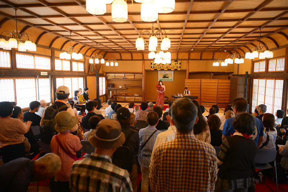 プログラムの一つである「枚方宿 古今東西音絵巻/古今東西が交わる瞬間~音の旅~」の舞台は、市立枚方宿鍵屋資料館にある国指定有形文化財の鍵屋別棟。貴重な折り上げ格天井を備えた2階の大広間は、シャンデリアがきらめき、当時の賑わいを今に伝えています。