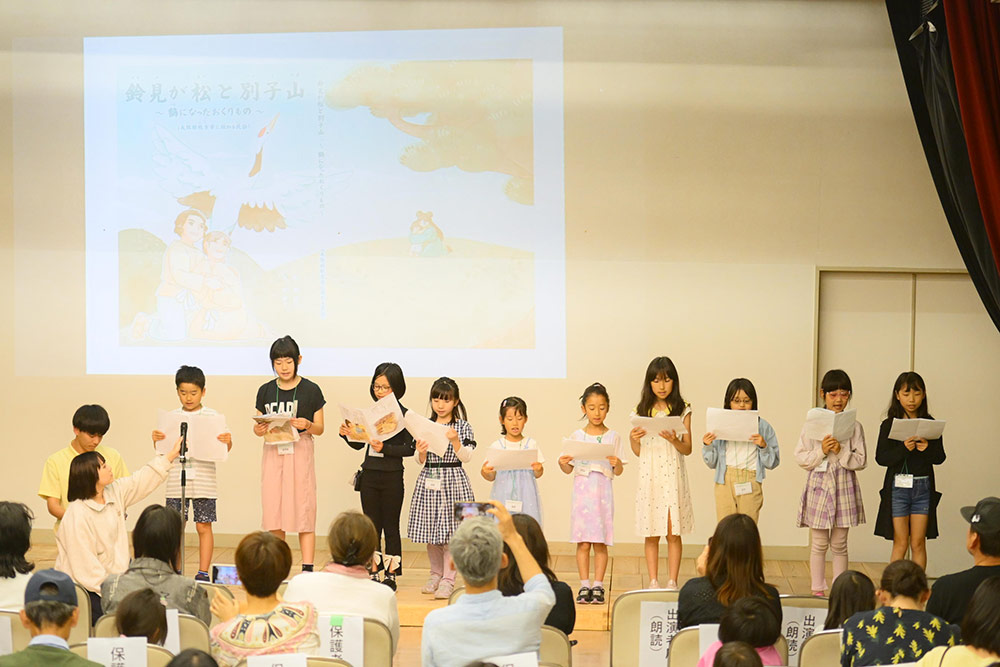 「新作絵本 朗読会」では、枚方市に伝わる民話「孝子鈴見と別子山」を元にした新作絵本「鈴見が松と別子山~鶴になったおくりもの~」の朗読を、地元枚方の小学生がワークショップなどで練習を重ね、本番に臨みました。