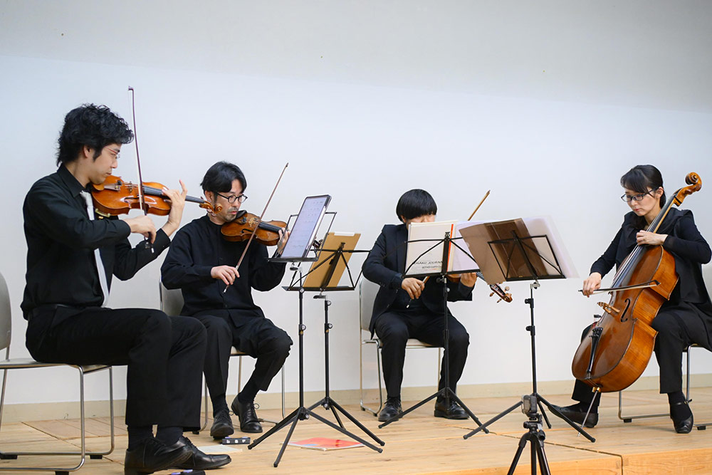 続いて、「弦楽四重奏 ミニコンサート」です。ヴァイオリン・堀江恵太氏と佐藤一紀氏、ヴィオラ・四家絵捺氏、チェロ・水野奈美氏が、絵本をテーマとした新曲「別れの風」(作曲:高木日向子)や、ジブリ作品の楽曲など全6曲を演奏。観客のみなさんはその美しい音色にうっとりと聞き入りました。