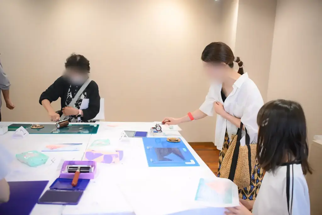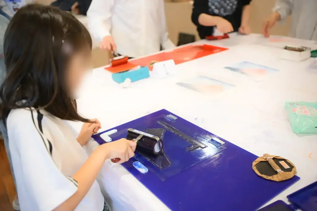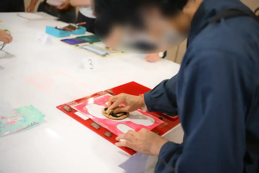 隣接する和泉市久保惣市民ギャラリーでは、樹脂版による浮世絵の摺りを体験できる「浮世絵ワークショップ」も行われました。絵柄は、葛飾北斎の「冨嶽三十六景 凱風快晴」と歌川国芳「猫の当て字 うなぎ」の2種。まずは、樹脂版の上にインクを塗り、目印に合わせて紙を置いたら、馬連(バレン)でまんべんなく転写していきます。それぞれ4色を順番に重ねていくと見事な絵柄が浮かびあがりました。スタッフのサポートで、子どもから大人まで多くの方が、気軽に浮世絵の魅力を体感することができました。