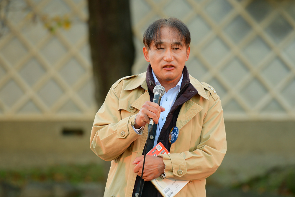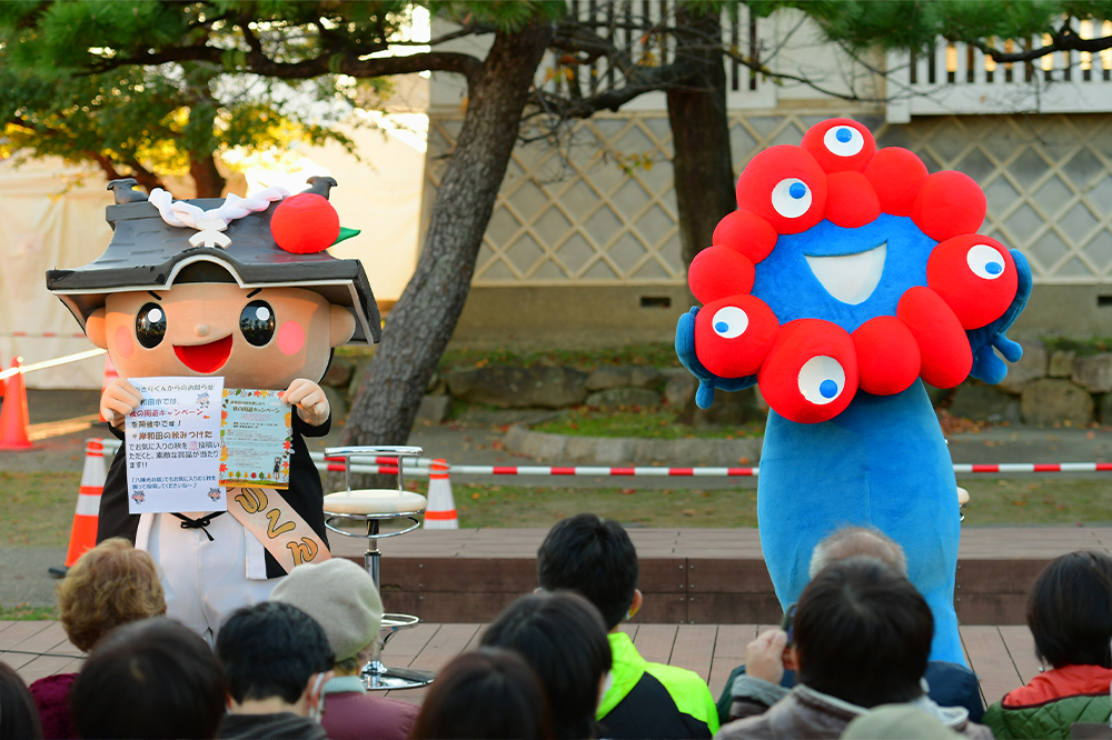 トークイベントは岸和田城二の丸広場で開催。MCがステージに大阪・関西万博公式キャラクターのミャクミャクを呼び込むと、岸和田市のイメージキャラクター、ちきりくんも応援にかけつけます。まずは撮影タイム。詰めかけた観客がミャクミャクとちきりくんの姿を撮影する間、ミャクミャクの名前に万博の開催意義が込められていることを説明。そして、大阪・関西万博の開催地や期間、テーマなどについても伝えられました。