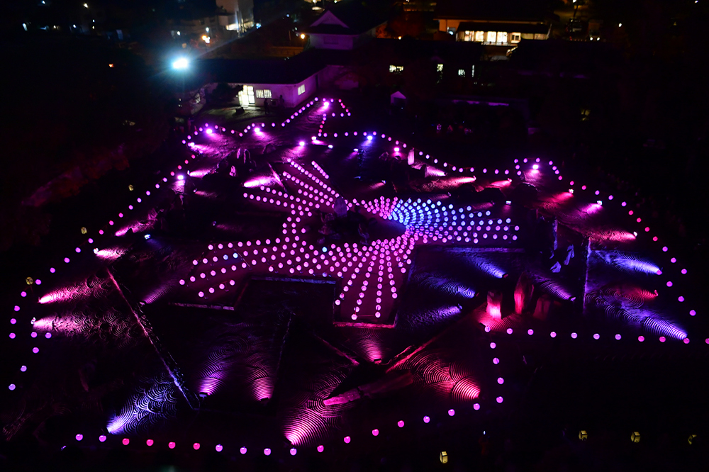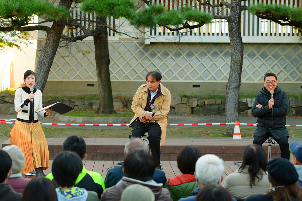 11月26日(日)から12月3日(日)(11月27日(月)除く) まで、国指定名勝岸和田城庭園(八陣の庭)などで「八陣光の庭 ~岸和田城で歴史と光のアートを楽しもう~」が開催されました。開催初日の11月26日(日)にはメッセンジャー・あいはららがトークイベントを行ったほか、アロージャズオーケストラを迎えての点灯セレモニーも開かれました。