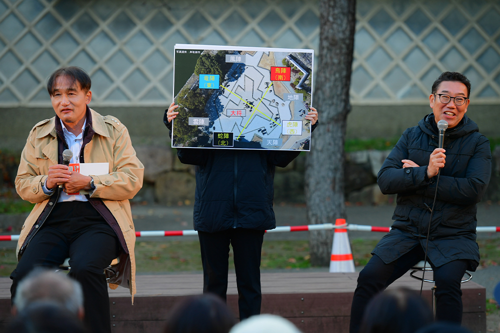 あいはらと、岸和田市教育委員会郷土文化課の山岡邦章氏がステージへ。あいはらは岸和田城が15年ぶりとのことで「久しぶりに来ました」と笑顔。そして「八陣の庭があったことも正直知らなかった」と明かし、「文化的な意味があるって聞いたけど、その時点で難しい」と笑わせます。