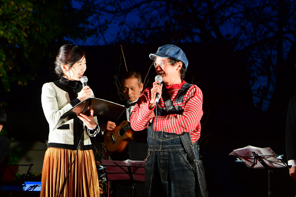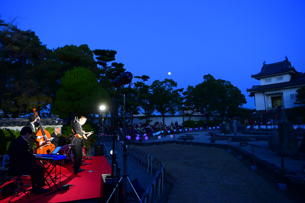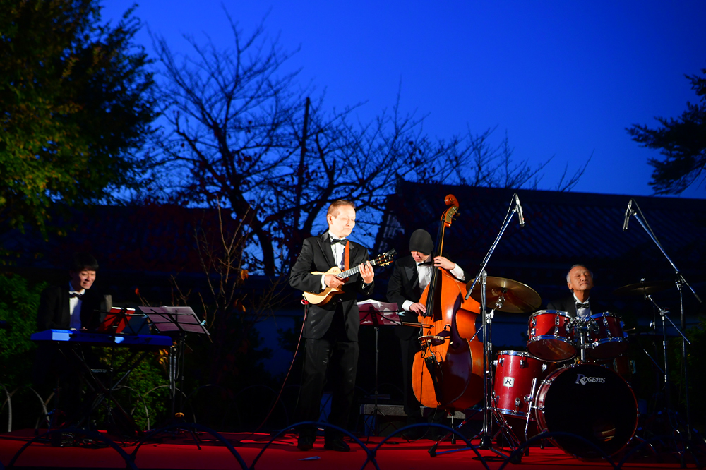 続いては国指定名勝岸和田城庭園(八陣の庭)での点灯セレモニー。イベントの趣旨説明のあとは、まずアロージャズオーケストラから特別編成のジャズカルテットが演奏。