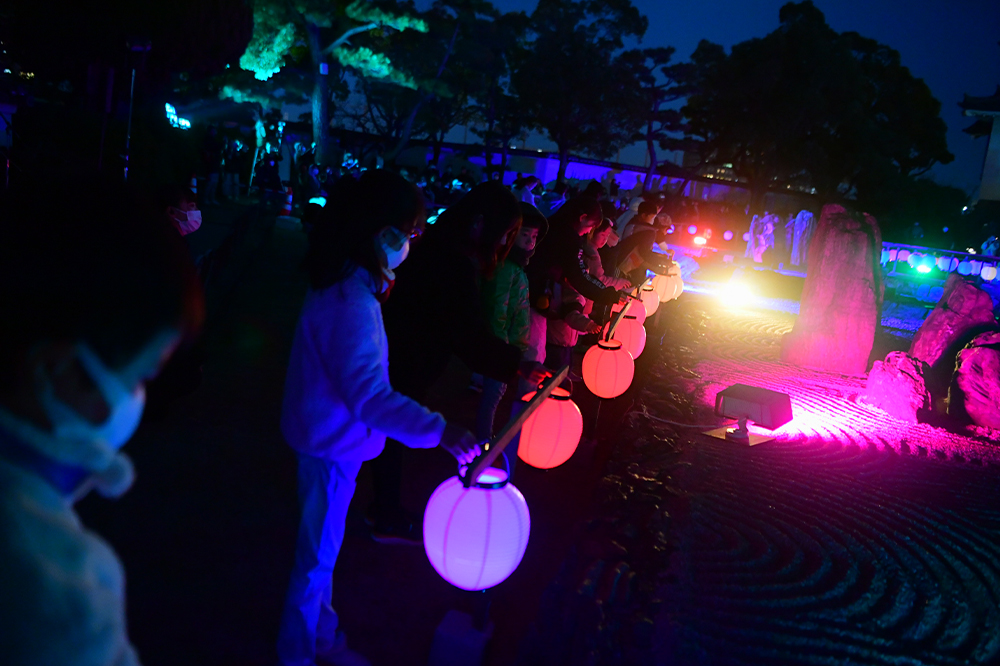 続いての点灯セレモニーには、今回八陣の庭を光のアートで彩った美術家の髙橋氏が登場。その略歴が紹介されたあと、今回の見どころやコンセプトについて髙橋氏は、「重森氏とのコラボレーション作品。重森氏の謎に対して、どういう光の作品を作るかという難しさでもあり、挑戦でもある」と話すと「コラボレーションというより作品を通じての対話」とも。「八陣の庭は360度めぐりながら見ていただく庭、四神それぞれの前でそれぞれの演出を感じ取ってもらえれば」と話すと、「もう一つは上からの視点、上から見るとわかる地上絵が描かれている、上からと下からではまた全然違う、両方楽しんでもらえれば」と伝えました。さらに「麒麟をどう表現するのかを一番考えた」と髙橋氏。「僕の思いとしては子どもたちこそ麒麟だと思っている」と話すと、「未来を担う子どもたちこそ麒麟じゃないかという思いから、今回子どもたちが参加するという考えに至った」とのこと。髙橋氏は「(作品は)今はまだ未完成、余白を最後に残している、それを(子どもたち)みんなに書いてもらうのが点灯セレモニーになる」と話すと、岸和田市の小学生たちが光の提灯を手に入場、アロージャズオーケストラが演奏で盛り上げます。子どもたちはそれぞれが手にした色とりどりの提灯を手にスタンバイ。カウントダウンのあと光が灯ると、八陣の庭、そして岸和田城が鮮やかな光に彩られました。