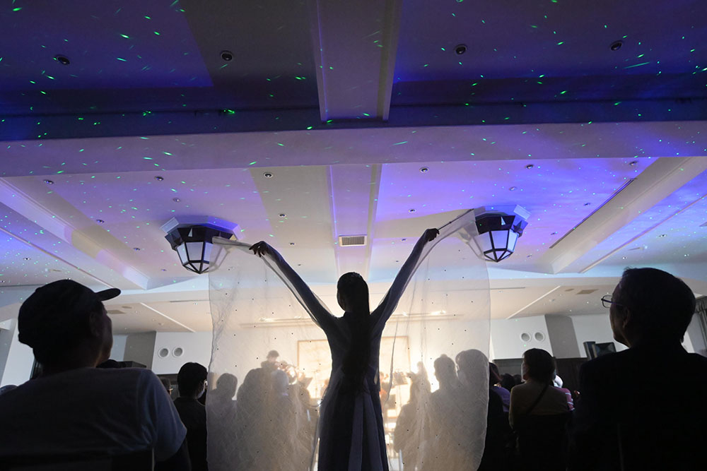 針山は、今日の踊りについて、バレエが初めてという人も身近に感じられて、楽しめて、明日へのモチベーションにつながるようなものになればと笑顔。そして「芸術には言葉、国境の壁がなく、繋がっていく力がある」と話すと、音楽とバレエを目と耳で感じてもらえたら、とアピールしました。続いては、アザラシヴィリ作「ノクターン(夜想曲)」、そしてサン=サーンス作 「白鳥」(バレエ「瀕死の白鳥」)へ。静かで寂しげな旋律をバックに、繊細な踊りで白鳥を表現する針山の姿に、会場も見入っていました。