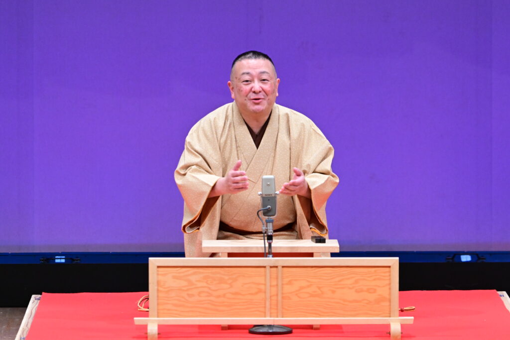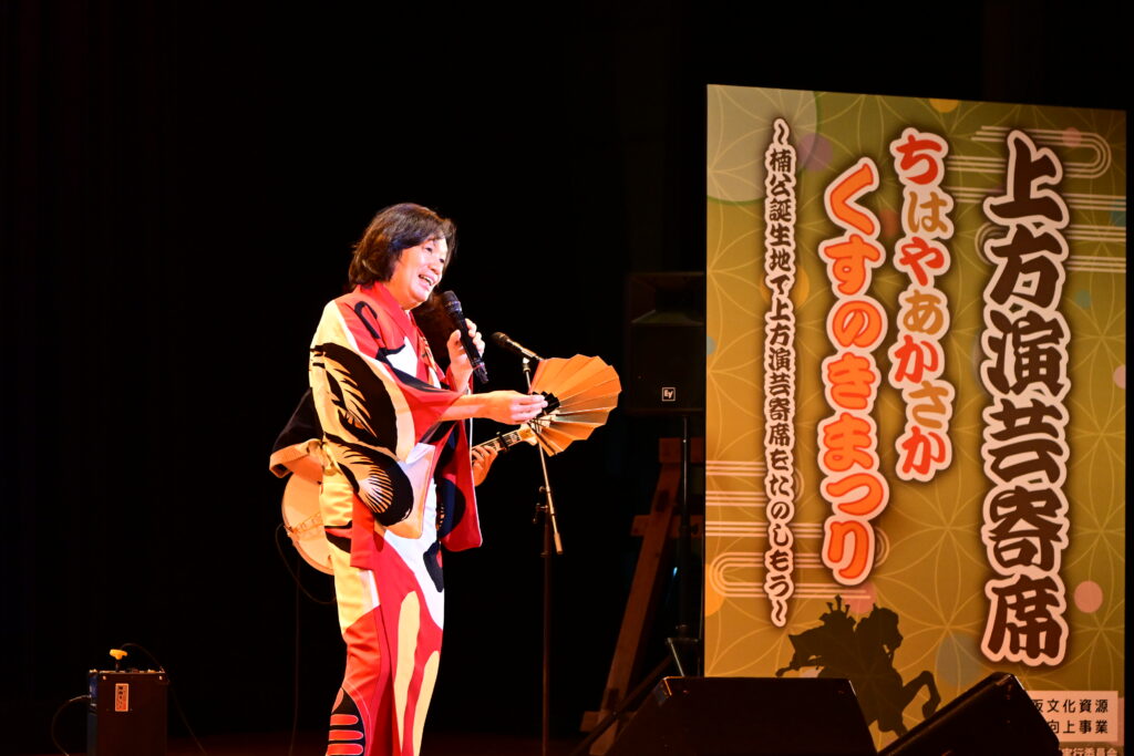 そして、旭堂小南陵の楠木正成公にまつわる講談へ。小南陵は講談について、昔は落語にならぶほどの人気があり、特に楠正成公にまつわる講談は、一年を通して公演されていた演目であったことをアピール。自身も南河内にゆかりがあることから、くすのきホールで楠正成公の講談を行うことが夢だったと明かします。演目では、楠正成公誕生にまつわる話を、講談ならではの力強さで表現し、会場を講談の世界へ引き込みました。