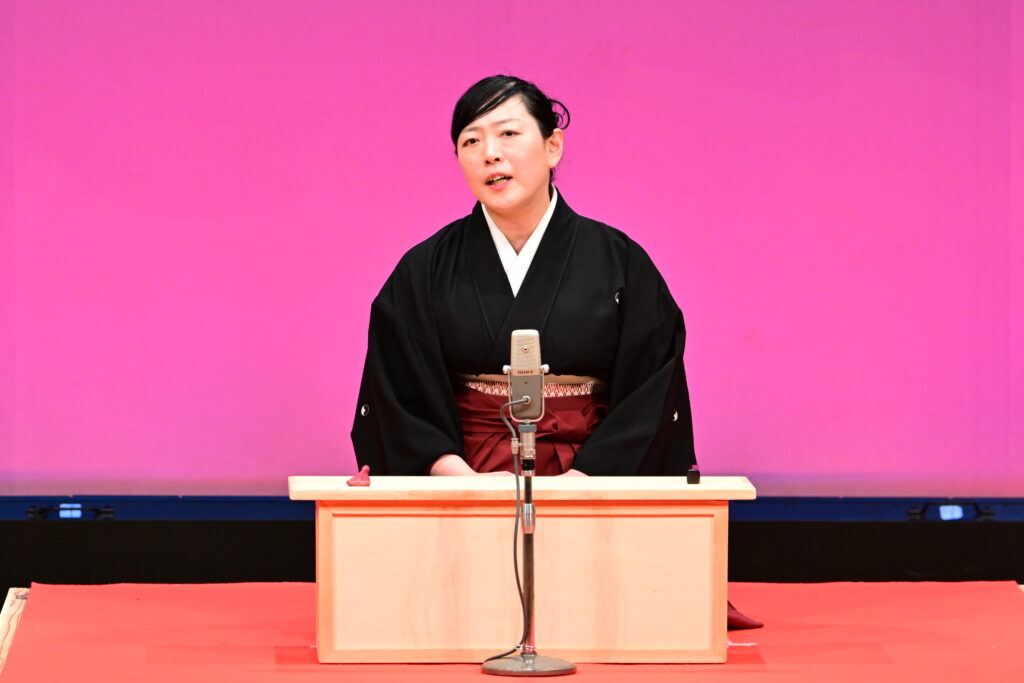 続いては菊地まどかの浪曲です。嫁に行く娘の心情、親の気持ちを「嫁ぐ日」で、じっくりと聞かせました。スマイル(瀬戸洋祐、ウーイェイよしたか)はデートをテーマにした漫才。よしたかの明るく勢いのあるボケに、瀬戸がツッコむたびに会場からは笑いが起こります。迫力のある獅子舞を見せてくれたのは、中津神社上若中。「花舞」、「乱曲」を披露しました。桂文三は落語「動物園」。動物園で働くことになった男のドタバタを巧みな話芸で聞かせると、会場は笑いに包まれます。