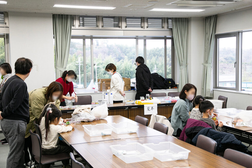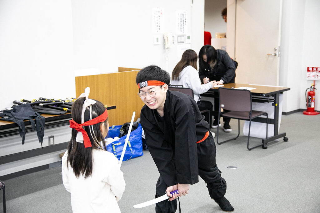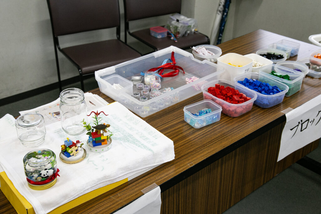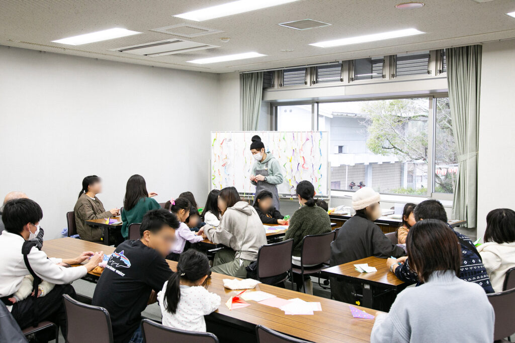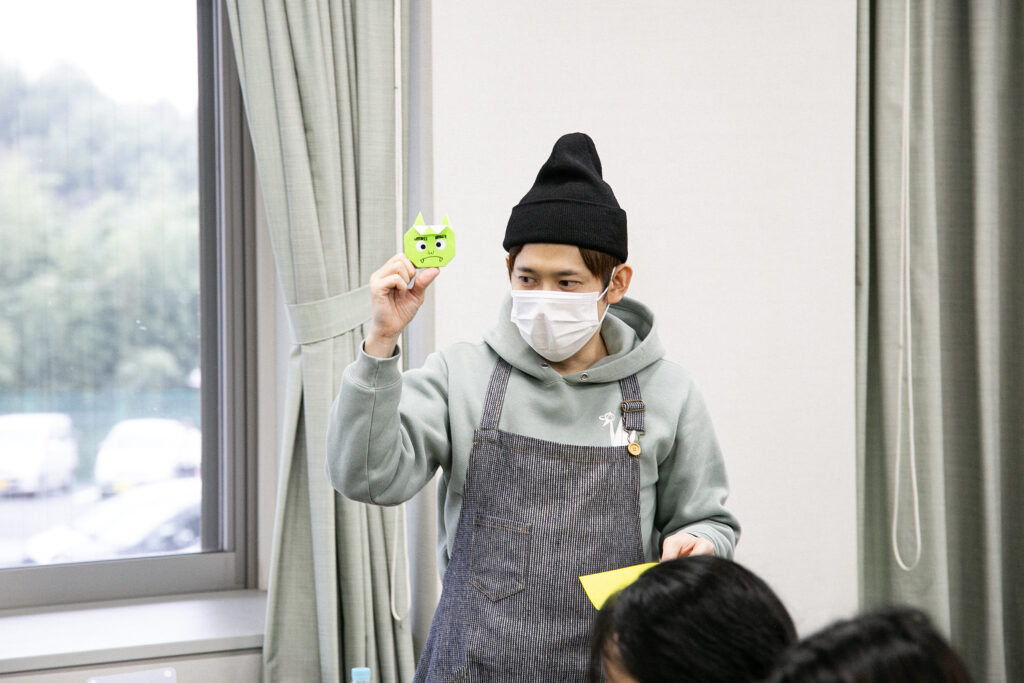 くすのきホール2階会議室で行われたのが、「span! マコトのみんなで折り紙ワークショック」、「ケバブ丸のみんなで忍者体験!」という2つのワークショップ。「忍者体験」では刀やちょんまげなどがスタンバイ。忍者芸人の稲田ケバブ丸が切られ役になり、ちびっこたちとちゃんばら体験を行ったほか、手裏剣を使った的当ても多くの子どもたちが楽しんでいました。「折り紙ワークショップ」は。折り紙講師の資格を持つマコトが簡単にできる折り紙をレクチャー。大人vs子どもで折り紙をできるだけ細く長く切っていく対決や、節分が近いということで、好きな色、柄の紙を選んで「鬼」の折り紙を作りも。ほかにもブロックや小さな人形などを使ったスノードーム作りも行われました。