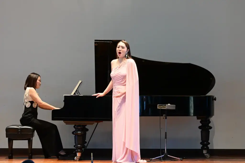 まずは、富貴晴美氏がピアノで「マッサン」「西郷どん」のメインテーマを披露。秋の空気に溶け込む音色が講堂に響き渡りました。続いては、ソプラノ・高野百合絵氏、ピアノ・越知晴子氏がパフォーマンス。フォーレ「ピエ・イエス」、ドヴォルザーク「ルサルカ」より「月に寄せる歌」、「You Raise Me Up」の3曲で、透き通る歌声を披露した高野氏は、「紅葉と歴史ある建物が素敵。リラックスして歌えました」と笑顔を見せました。