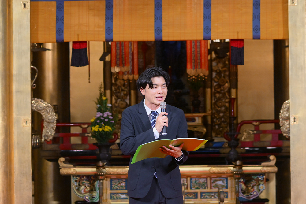 まずは、MCのコウノ・オブ・ザ・イヤー(元・令和喜多みな実、河野良祐氏)が顕証寺本堂に登場。今の芸名の由来などを話し、自己紹介しました。