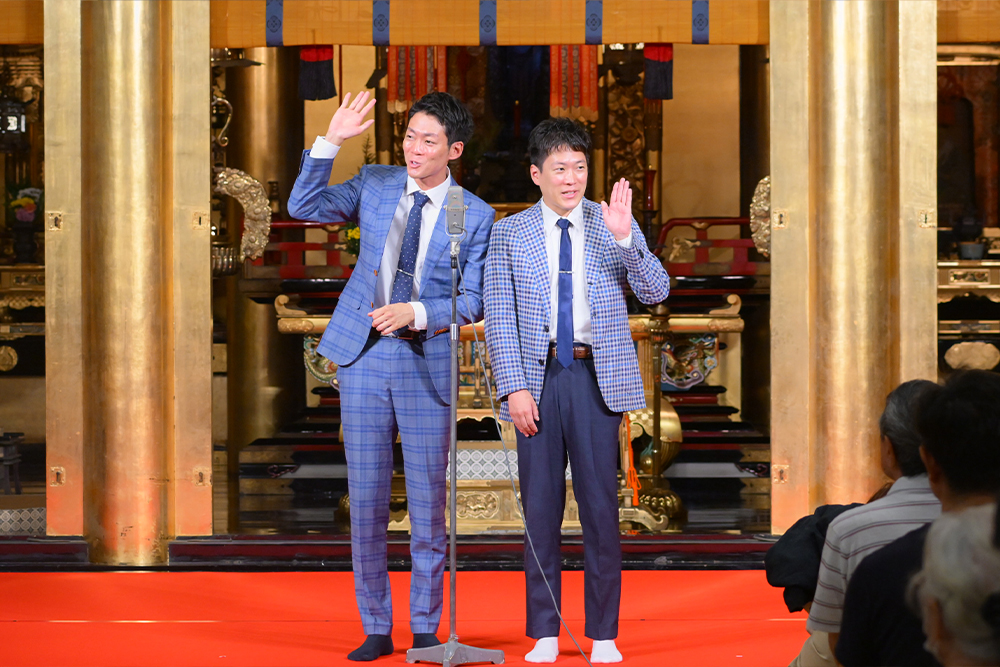 さて次は、お笑いステージです。ネイビーズアフロ(みながわ氏、はじり氏)が漫才を披露。この日のためだけに書き下ろした新作で、顕証寺をより詳しく魅力的に紹介。名言などを盛り込みながらも、しっかり笑える、面白くてためになるネタで盛り上げました。