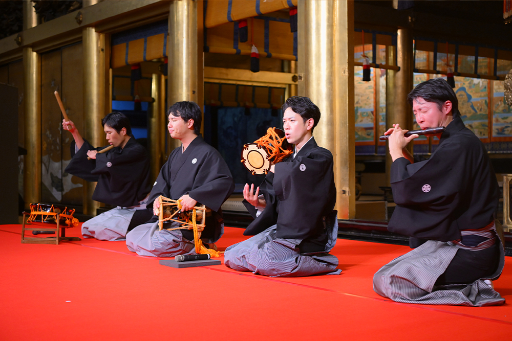 続いては、4人組の能楽囃子ユニット、ナニワノヲト‐Naniwanowoto(笛・貞光智宣氏、小鼓・成田奏氏、大鼓・山本寿弥氏、太鼓・中田一葉氏)の演奏です。ナニワノヲト‐Naniwanowotoは、幅広い世代に能楽囃子の面白さや魅力を発信し、未来に繋げることを目的に活動している若手能楽師ユニットです。