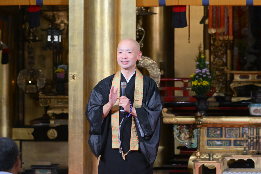 続いて、顕証寺近松真定住職を招きます。近松住職は登壇すると仏さまに手を合わせ、トークショーがスタート。顕証寺の成り立ちや本堂について、そして、地域の方の心の拠り所として顕証寺があること、本願寺の蓮如上人についてわかりやすく説明していただきました。また、久宝寺寺内町の成り立ち、本願寺が東西に分かれた理由も教えていただけました。最後に住職は「顕証寺は大阪府の指定文化財ですが、国の重要文化財になるよう働きかけています。応援してください」と観客のみなさんにメッセージを送りました。