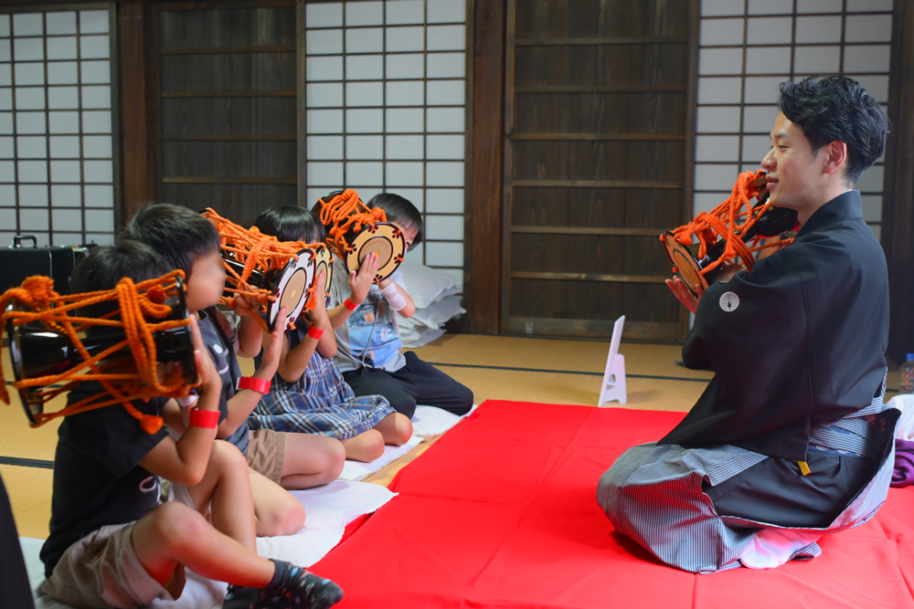 また、本堂での能楽演奏を行ったナニワノヲト-Naniwanowoto(小鼓・成田奏氏、大鼓・山本寿弥氏、太鼓・中田一葉氏)による「楽器体験ワークショップ」も行われました。